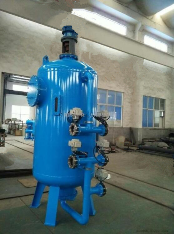 該型過(guò)濾器過(guò)濾時(shí)濾液高進(jìn)低出,反洗時(shí)反洗 水低進(jìn)高出,反洗水不間斷,清水消耗量大;攪拌 槳葉采用標(biāo)準(zhǔn)直葉片或斜葉片,對(duì)濾料傷害大,槳 葉一般不反轉(zhuǎn),使纖維球和水流同向旋轉(zhuǎn)運(yùn)動(dòng),導(dǎo)致反洗水對(duì)濾料沖洗力不大,濾料不易洗凈。